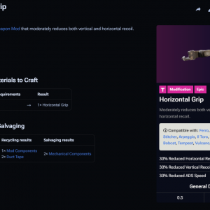 | Upgrade | Ingredients | Gunsmith Requirement | Result | Perks |