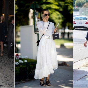 While out shopping with friends, she wore another coded look with a collarless black leather jacket, white jeans, and another band. Finish with cozy casere socks and corded bag for that model off...